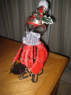 - Found a great charity shop that is FULL of junk. Yes, lots of junk, but some treasures buried within. So here I got (an Xmas gift that can't be pictured), a ceramic receptacle for our kitchen counter and utensils, and I don't think that counts against me, and this awesome wrought-iron Santa all for $5!! The guy was nice, and that was all the cash I had. So the Santa I will take as my own and it worked out to $1.02. Gotta love charity shopping! Plus I decorated the Santa to make him a bit more festive - I swear those types of things go for >$30 at craft shows!
